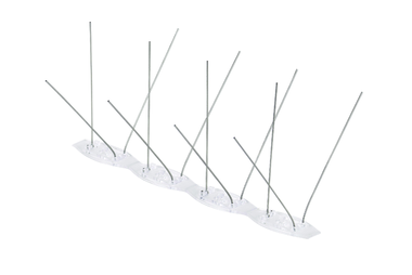 System of pins and barriers to protect buildings from bird droppings. Helps preserve and maintain hygiene on building façades without injuring birds. Surfaces to be protected: pediments, cornices, window sills, monuments, statues, gutters, signs, etc. UV-protected polycarbonate base Transparent flanges. AISI 303 stainless steel pins 13 diam., standard: AFNOR X10CRNI18-8. 48 pins per linear metre. Price per 10 m roll. Installs on any surface with adhesive (MS Polymère transparent mastic), screws, or nails (pre-drilled)