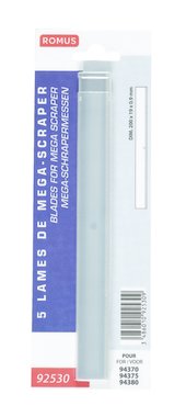 For mega Scraper Card of 10 blades in automatic dispenser Box of 100 blades. Pack of 5 blades. Card 10 blades «Mega scraper» blades PRODUCT DESCRIPTION L. 200 mm x W.19 mm x Th. 0.90 mm. Find out more CHOICE OF CRITERIA 200 mm 19 mm 0.90 mm