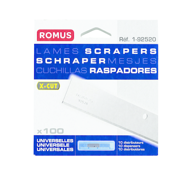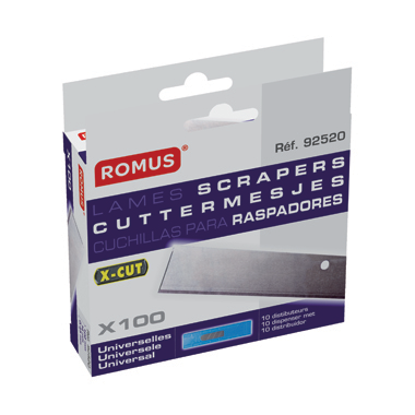 Box of 100 blades. In automatic 10 blade dispenser. Pack of 5 blades. Box of 100 blades. 10 blades safety dispenser Universal Card of 10 blades in automatic dispenser Box of 100 blades. Pack of 5 blades. Card 10 blades Universal scraper blades PRODUCT DESCRIPTION L. 102 mm x l. 18 mm x Th. 0,50 mm. Find out more CHOICE OF CRITERIA 102 mm 18 mm 0.50 mm