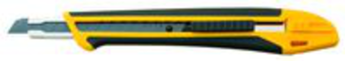 Black Olfa blade. Steel blade guide. Yellow polypropylene and black elastomer non-slip handle . Self-locking. Break-off blade tip clip. On card.