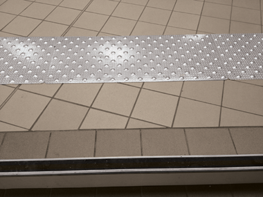 Tactile and visual tile intended for alerting blind and partially sighted people to imminent dangers on their way like. Attractive tile in 1.5 mm thick buckled knurled mill aluminium sheet, with rice pattern making it highly anti-slip. Drilled tile. Fixing with Ø 3.5 x 35 mm stainless steel screws (not supplied). Weight: approx. 2 kg.