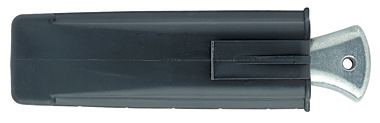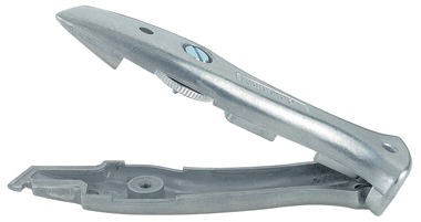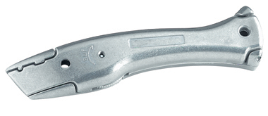 En aluminium moulé et poli. Ouverture par molette sur la tranche. Livré sans lame avec étui plastique de protection.