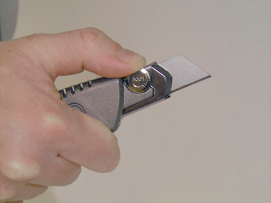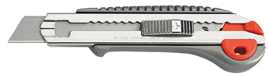 Blocage par molette. Casse-lame séparé. Livré sur carte blister avec 3 lamesde 18 mm dans le chargeur. Corps en aluminium.