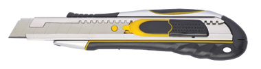 Cutter lame 18 mm. 2 positions : 1 position cutter lame fixe, 1 position couteau de sécurité lame autorétractable. Manche bimatière.