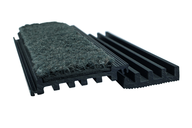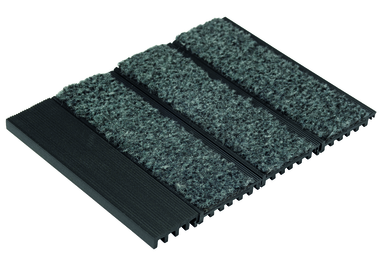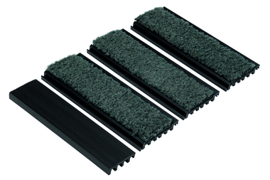 Constitué de profils PVC RIGIDES noirs (livrés individuelles, en kit à assembler sur chantier), sur lesquels sont collés des inserts textiles polyamide Boulevard 5000, ayant des qualités de rétention d’humidité et d’élimination des salissures.